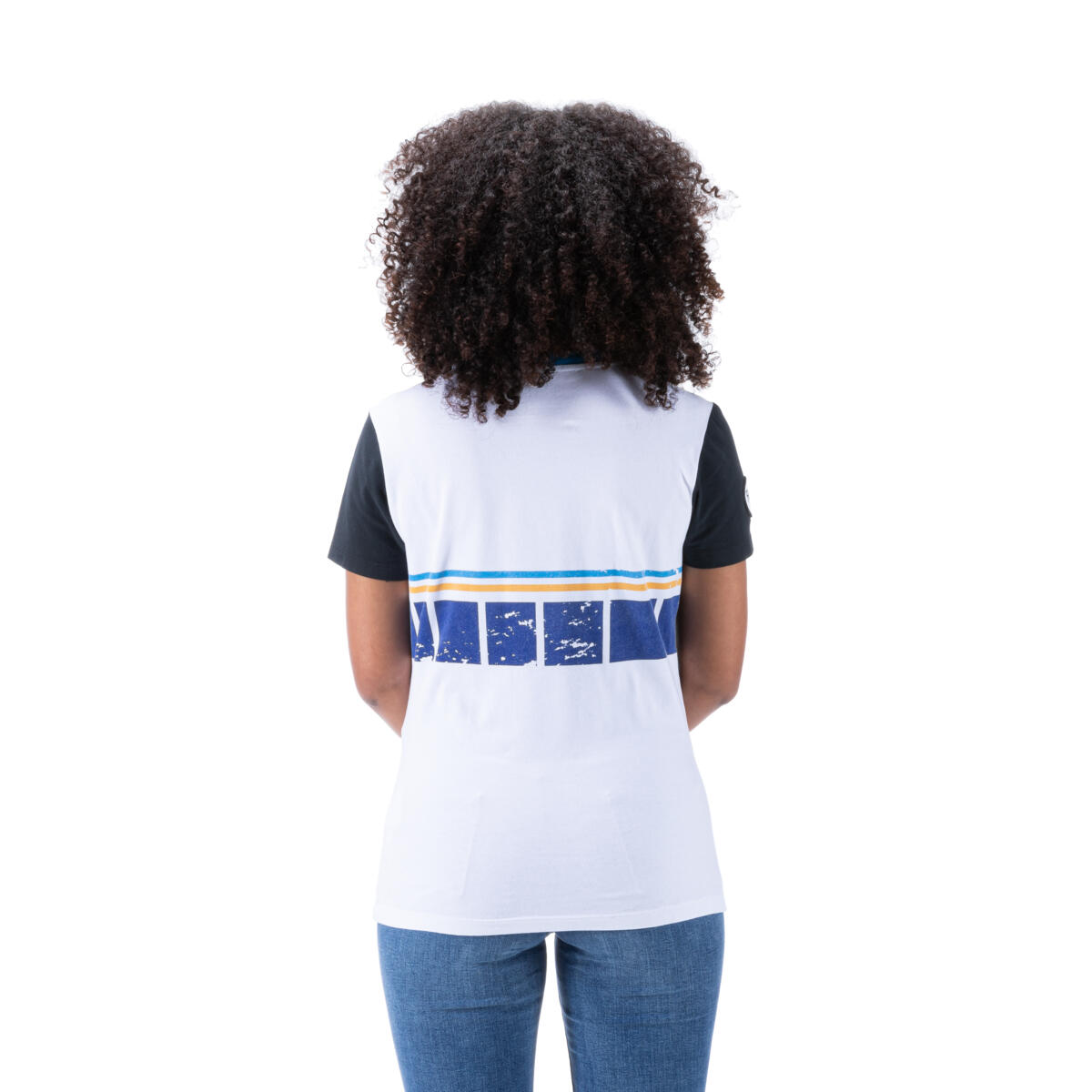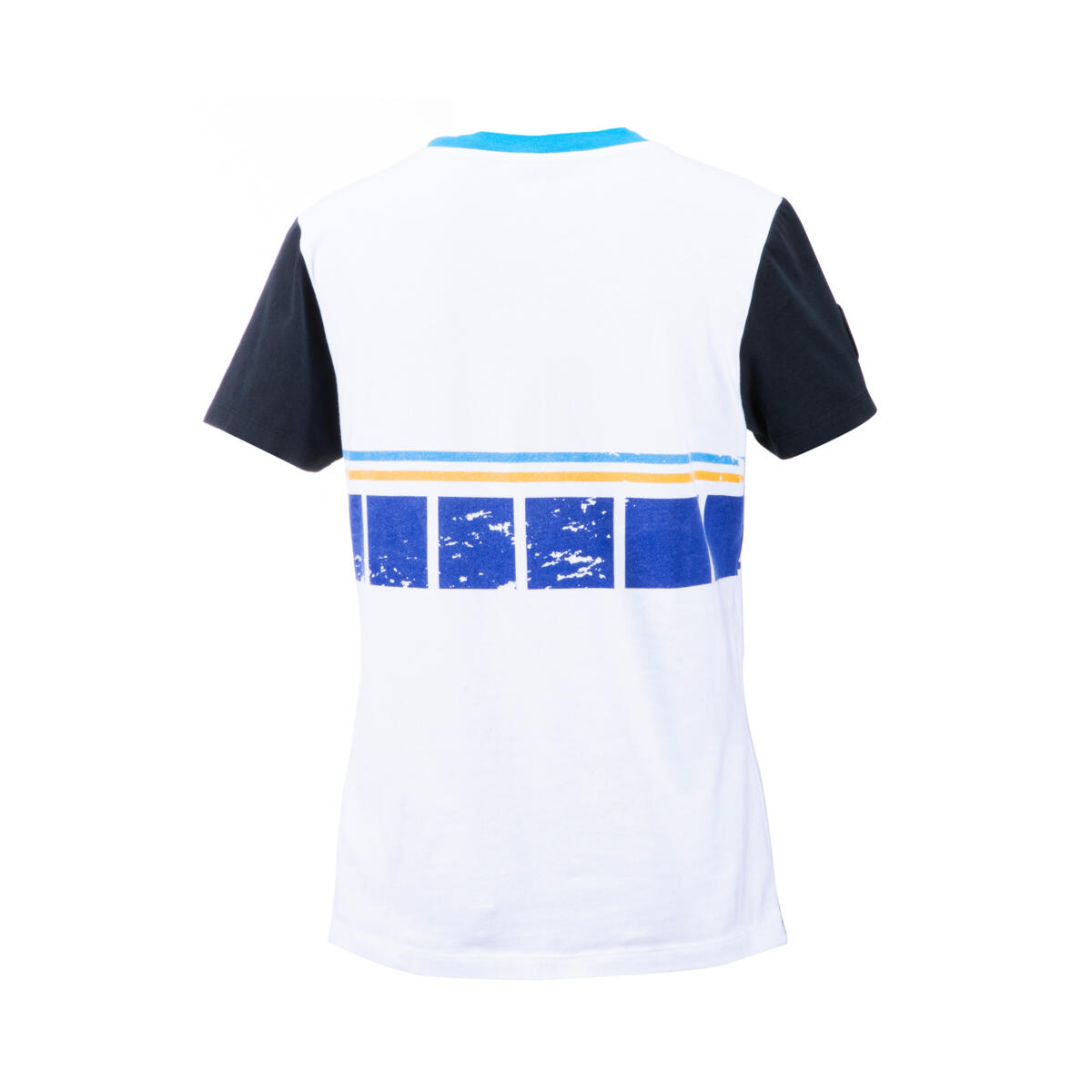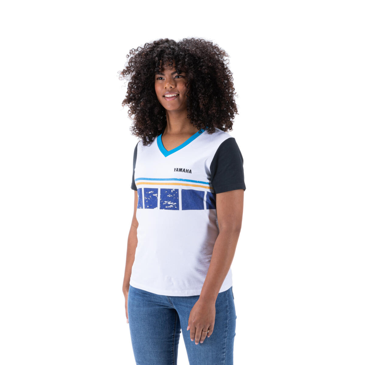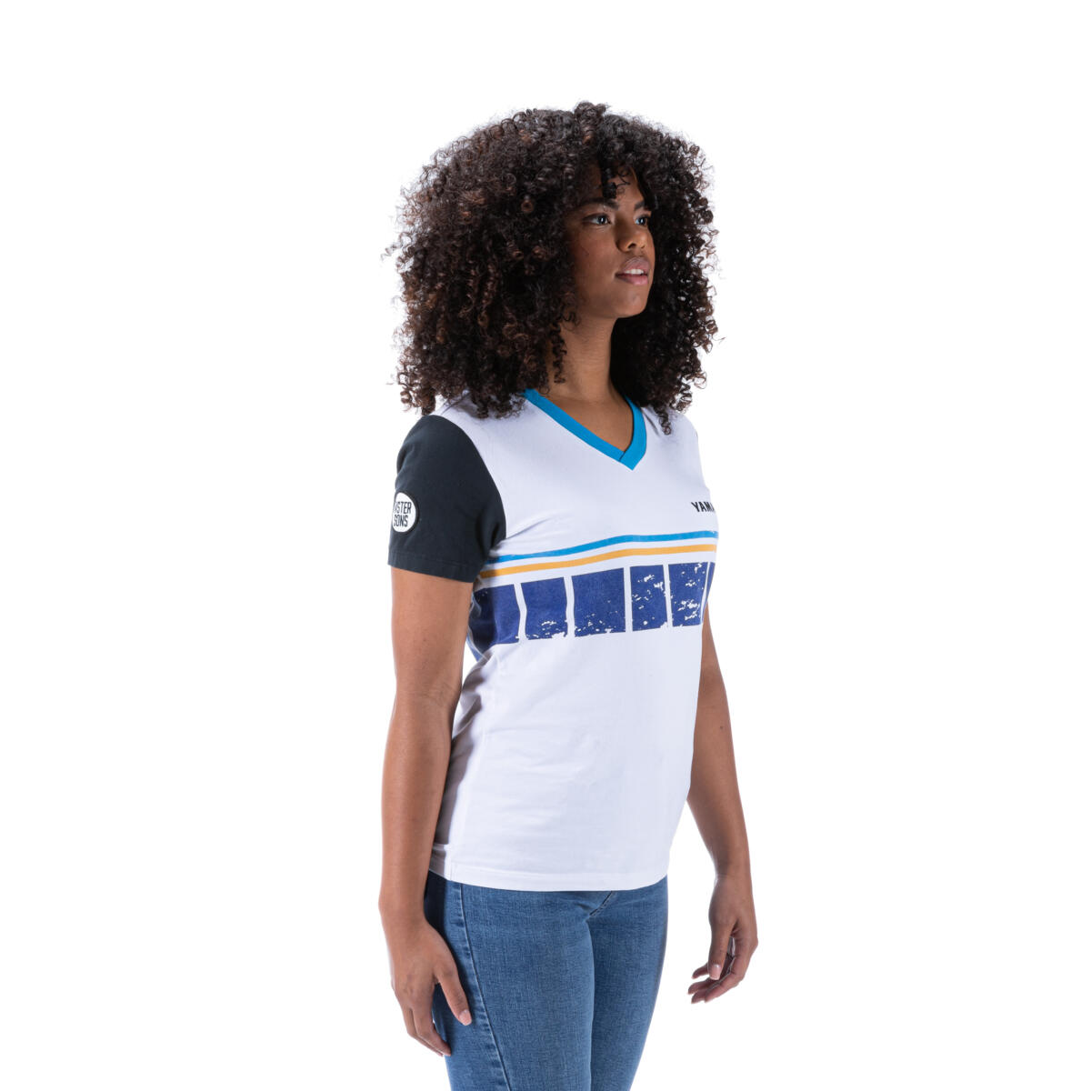 A bold and colourful display of Yamaha Sport Heritage, the Faster Sons speed block t-shirt for women is an eye-catching piece for everyday wear. A blend of organic cotton and elastane afford comfort and mobility, with a white body featuring a racing blue speed block graphic, heritage stripes and Yamaha branding on the chest. Colour contrast black sleeves and light blue V-neck create a standout vintage look that fits in perfectly with the XSR range.